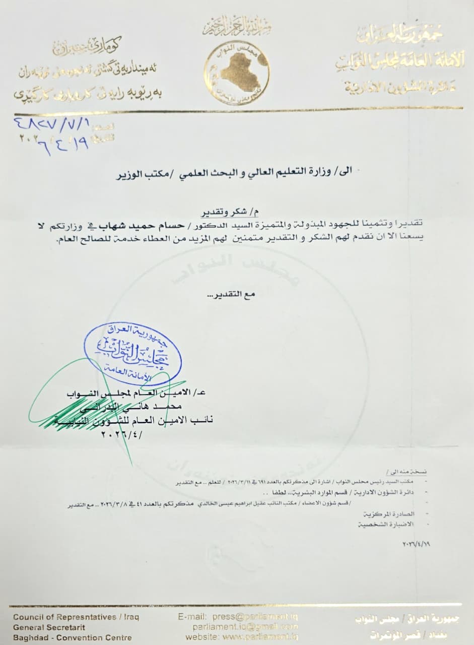 حصل الاستاذ الدكتور حسام حميد شهاب التدريسي على ملاك كلية القانون في جامعة تكريت على كتاب شكر وتقدير من الأمانة العامة لمجلس النواب، تثمينآ لجهوده العلمية وإسهاماته المتميزة في المجال الأكاديمي والبحثي وجاء هذا التكريم تثميناً لدوره الفاعل في دعم المسيرة العلمية، ومشاركته في إعداد الدراسات والبحوث التي تسهم في تطوير العمل المؤسسي وتعزيز الأداء الحكومي.