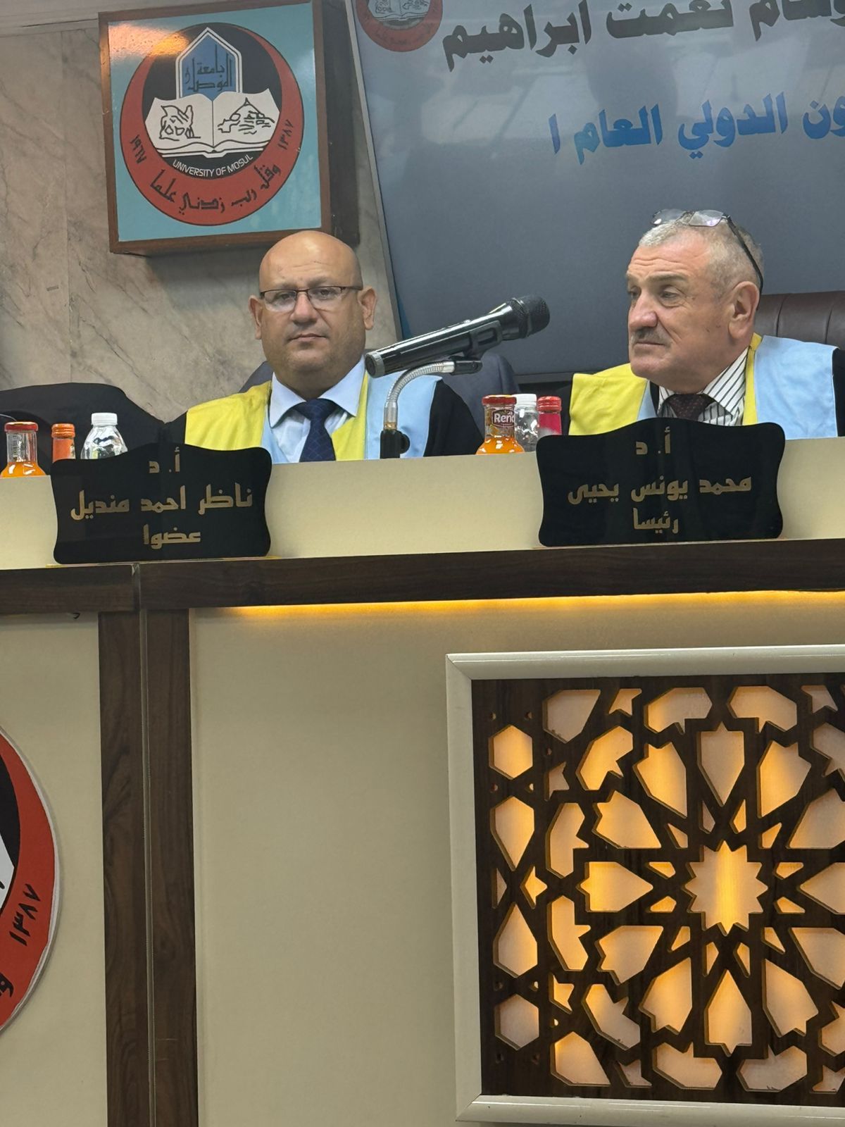 شارك الأستاذ الدكتور ناظر احمد منديل هذا اليوم المصادف ٢٠٢٥/٧/٢٢ في مناقشة أطروحة الدكتوراه الموسومة (التعايش السلمي في اطار المواثيق الدولية والتشريعات الوطنية) للباحث (رسول محمد سعيد) وذلك في كلية الحقوق بجامعة الموصل سائلين المولى عز وجل ان يوفق الجميع لما فيه خيراً للعراق وسموه.