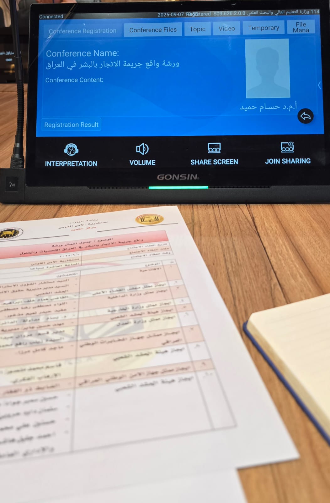 شارك الاستاذ الدكتور حسام حميد شهاب التدريسي على ملاك كليتنا بورشة علمية بعنوان (واقع جريمة الاتجار بالبشر في العراق التحديات والحلول) التي اقيمت في مستشارية الامن القومي وذلك في يوم الاثنين الموافق 8- 9- 2025 .