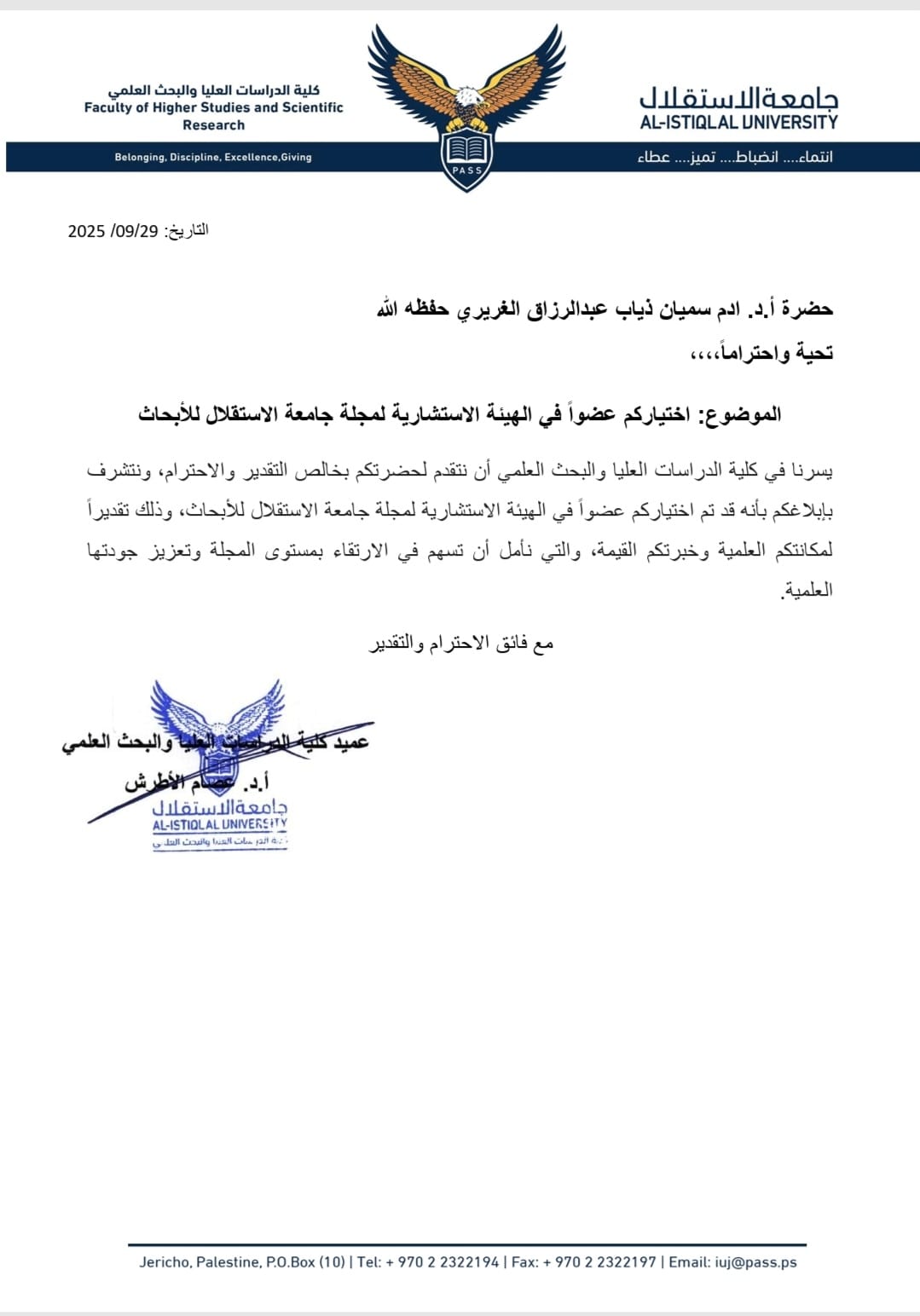 شارك الاستاذ الدكتور ( ادم سميان ذياب ) التدريسي في كلية القانون بجامعة تكريت عضواً في الهيئة الاستشارية لـ مجلة جامعة الاستقلال للأبحاث في دولة فلسطين.
