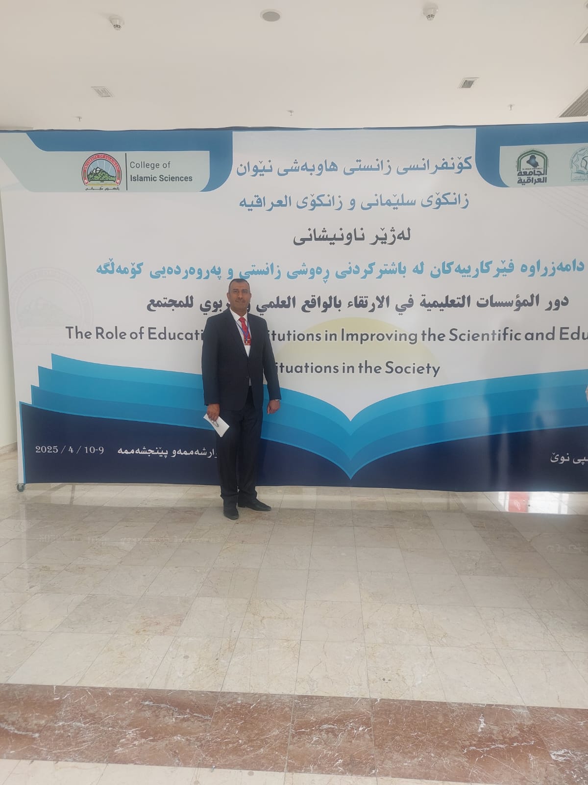شارك الاستاذ الدكتور عدي طلفاح محمد في المؤتمر العلمي المشترك بين كلية العلوم الاسلامية بجامعة السليمانية وكلية التربية للبنات بالجامعة العراقية في جامعة السليمانية تحت عنوان "دور المؤسسات التعليمية في الارتقاء بالواقع العلمي والتربوي للمجتمع"وكان عنوان البحث "دور المؤسسة الدينية والقانون في مواجهة العنف والتطرف" الذي اقامته جامعة السليمانية يومي الأربعاءوالخميس في 9- ١٠/ 4/ 2025، سائلين المولى عز وجل ان يوفق الجميع بما فيه خيراً للعراق وسموه.