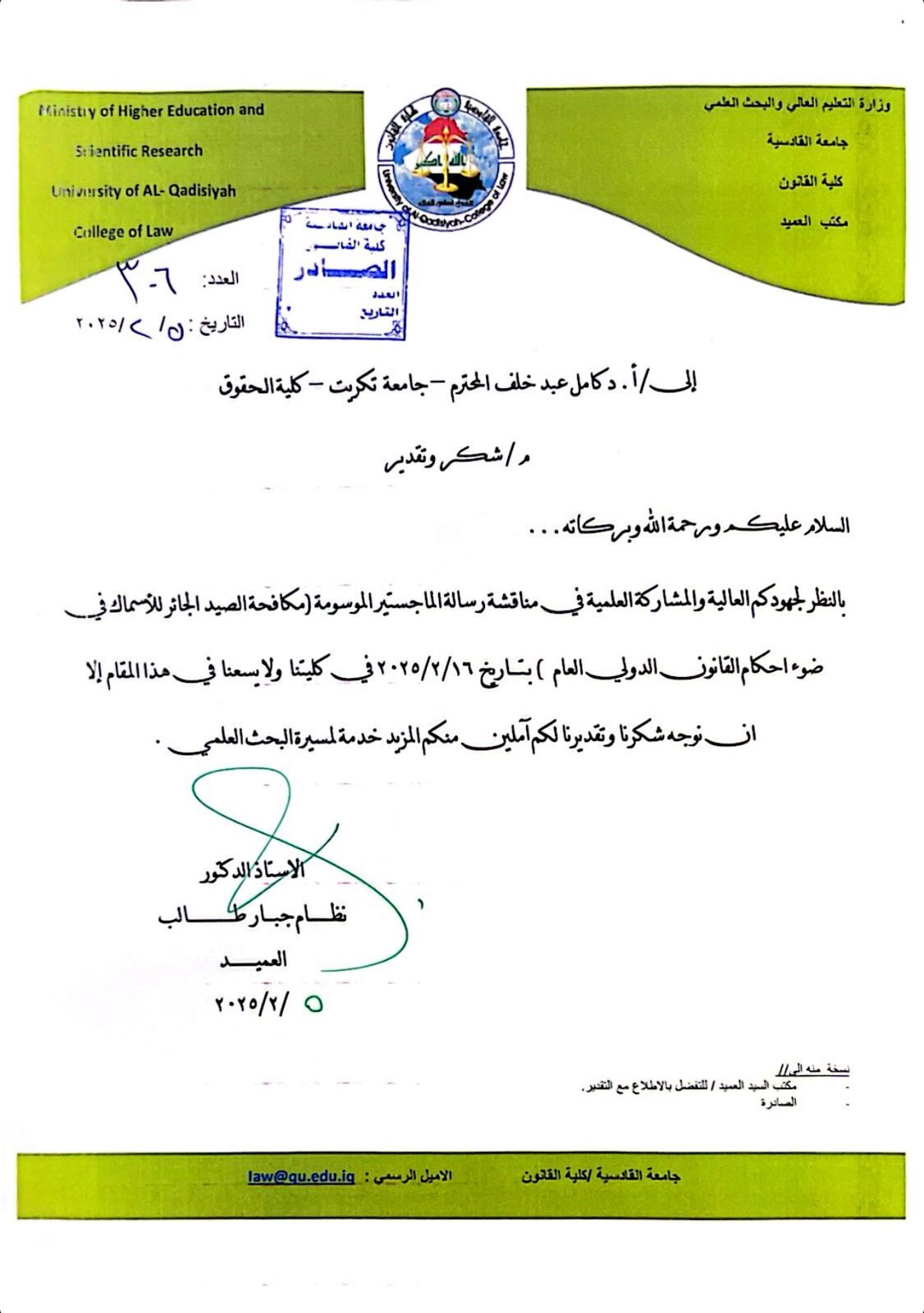 شارك الاستاذ المساعد الدكتور كامل عبد خلف العنكود التدريسي على ملاك كليتنا لجنة مناقشة رسالة الماجستير في كلية القانون بجامعة القادسية والموسومة ب "مكافحة الصيد الجائر للأسماك في ضوء أحكام القانون الدولي العام" للطالبة (رملة وليد عبد) صباح يوم الاحد الموافق 6-2-2025.