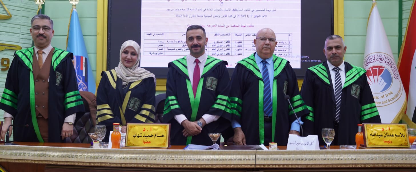 شارك الاستاذ الدكتور حسام حميد شهاب التدريسي على ملاك كليتنا لجنة مناقشة رسالة الماجستير في كلية القانون والعلوم السياسية بجامعة ديالى والموسومة ب "الحماية الدولية للمفقودين والمتوفين في ظل قواعد القانون الدولي الانساني" للطالبة (نوال كريم رحيم) صباح يوم الاحد الموافق 17-11-2024 .