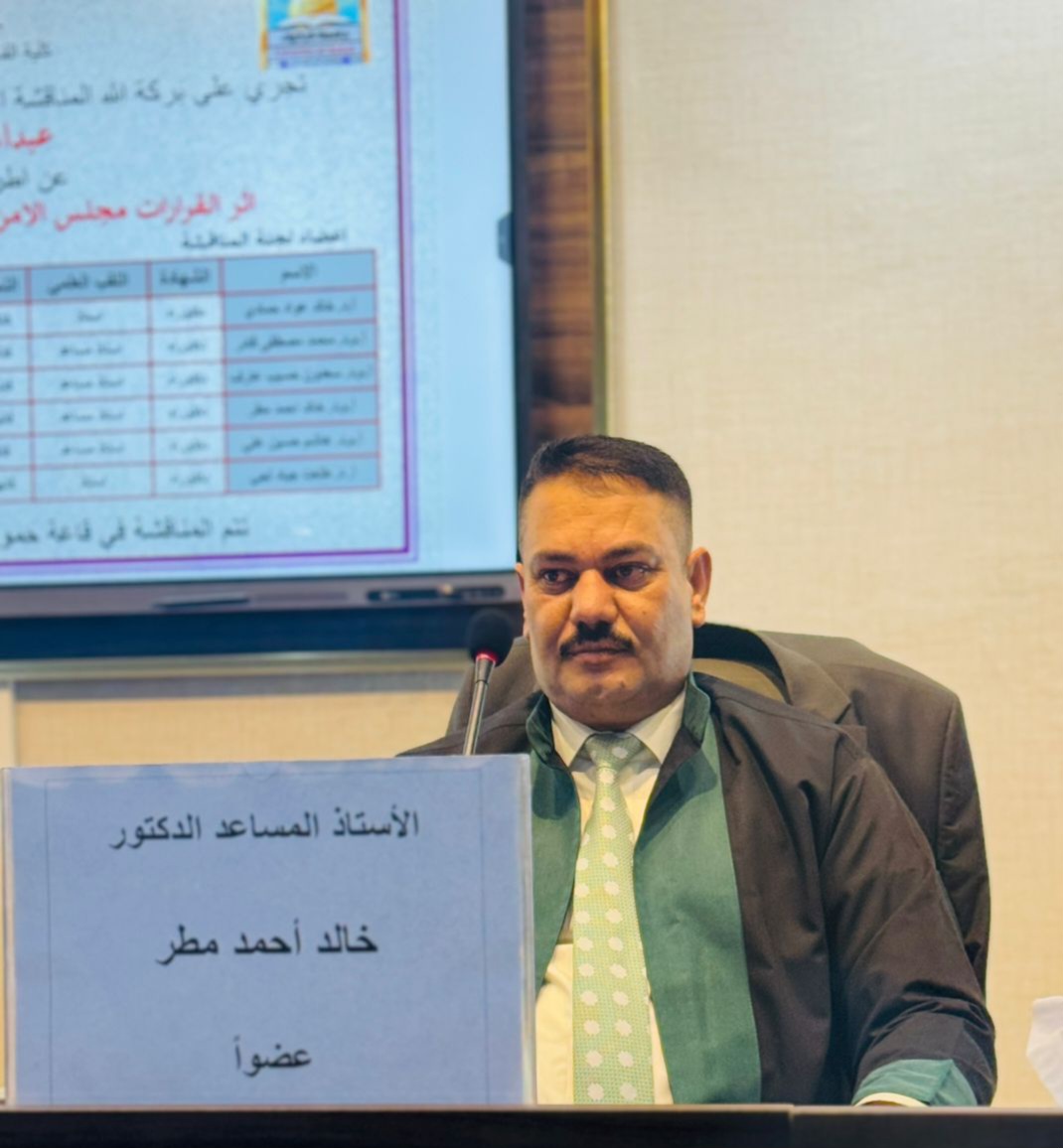 شارك الاستاذ المساعد الدكتور خالد احمد مطر التدريسي على ملاك كليتنا لجنة مناقشة اطروحة الدكتوراه في كلية الحقوق بجامعة الموصل والموسومة ب "أثر قرارات مجلس الامن الدولي على المعاهدات الدولية - دراسة مقارنة" للطالب(عبدالله حسن مرعي) صباح يوم الاربعاء الموافق 13-11-2024 .