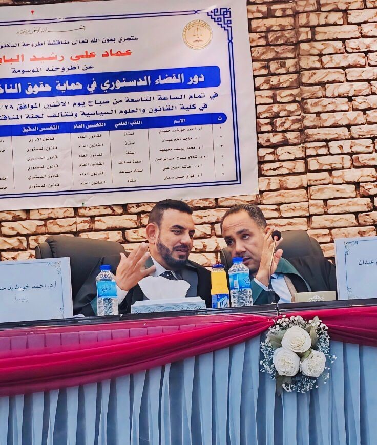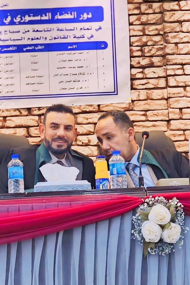 شارك الاستاذ الدكتور محمد يوسف محيميد التدريسي في كلية القانون بجامعة تكريت في مناقشة أطروحة الدكتوراه في كلية القانون والعلوم السياسية بجامعة كركوك والموسومة"دور القضاء الدستوري في حماية حقوق الناخبين(دراسة مقارنة)" للطالب عماد علي رشيد .