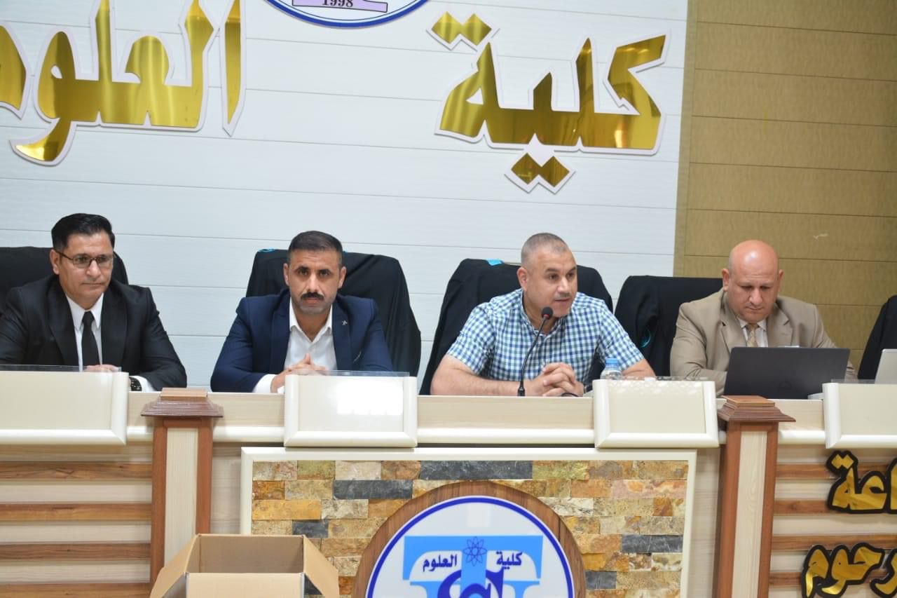في الندوة المقامة من قبل مركز التعليم المستمر بالتعاون مع شعبة السلامة والامن الكيميائي والبايولوجي والاشعاعي في رئاسة الجامعة وجهاز الامن الوطني العراقي وكلية العلوم دورة بعنوان (التداول الامن للمواد الكيميائية والبايولوجية والاشعاعية ذات الاستخدام المزدوج)