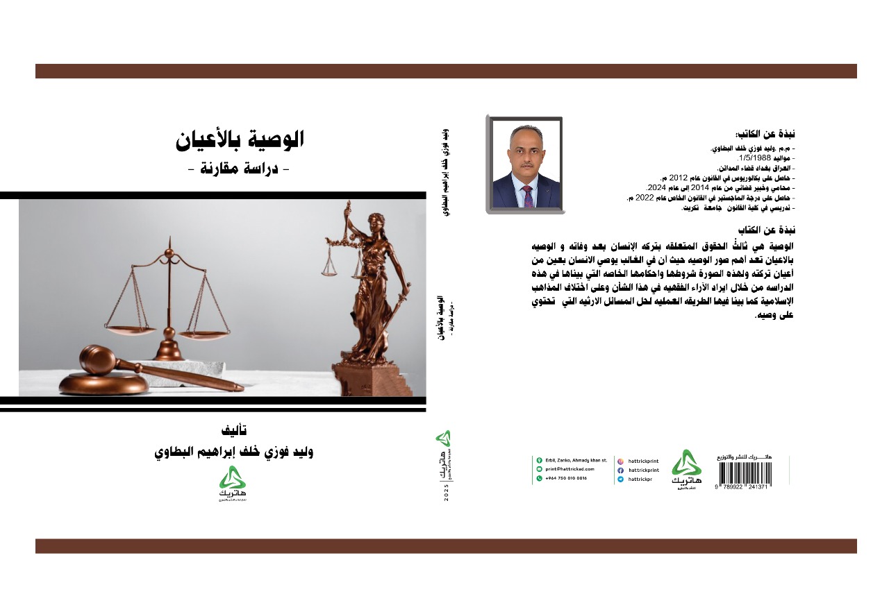صدر مؤلف جديد للمدرس المساعد "وليد فوزي خلف البطاوي" مدرس القانون المدني التدريسي على ملاك كليتنا بعنوان "الوصية بالاعيان - دراسة مقارنة" كإسهام علمي جديد يضاف إلى نتاجات القانون المدني في جامعة تكريت وكلية القانون.