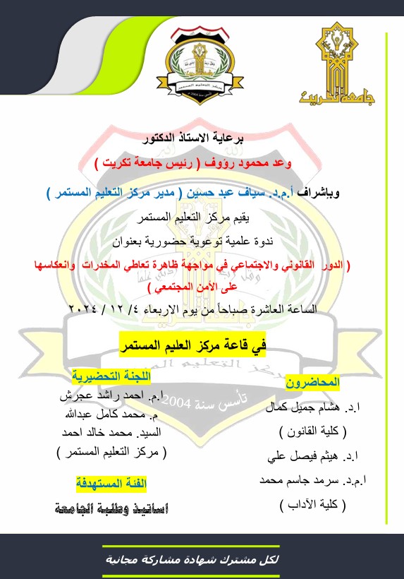 شارك الاستاذ الدكتور هشام جميل كمال التدريسي على ملاك كليتنا ندوة علمية توعوية بعنوان (الدور القانوني والاجتماعي في مواجهة ظاهرة تعاطي المخدرات وانعكاسها على الامن المجتمعي) في قاعة مركز التعليم المستمر صباح يوم الاربعاء الموافق 4-12-2024 .