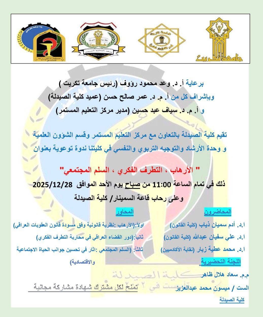 شارك كل من الاستاذ الدكتور ادم سميان ذياب والاستاذ المساعد علي سفيان عبد الله التدريسيان على ملاك كلية القانون – جامعة تكريت في الندوة التوعوية التي أقامتها كلية الصيدلة بعنوان (الإرهاب، التطرف الفكري، السلم المجتمعي)، يوم الاحد الموافق 28-12-2025 وذلك بحضور عدد من التدريسيين والطلبة