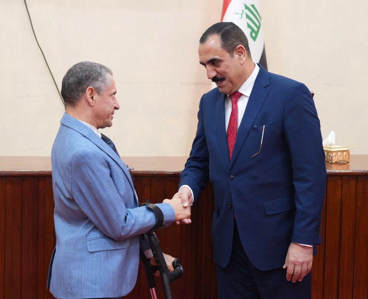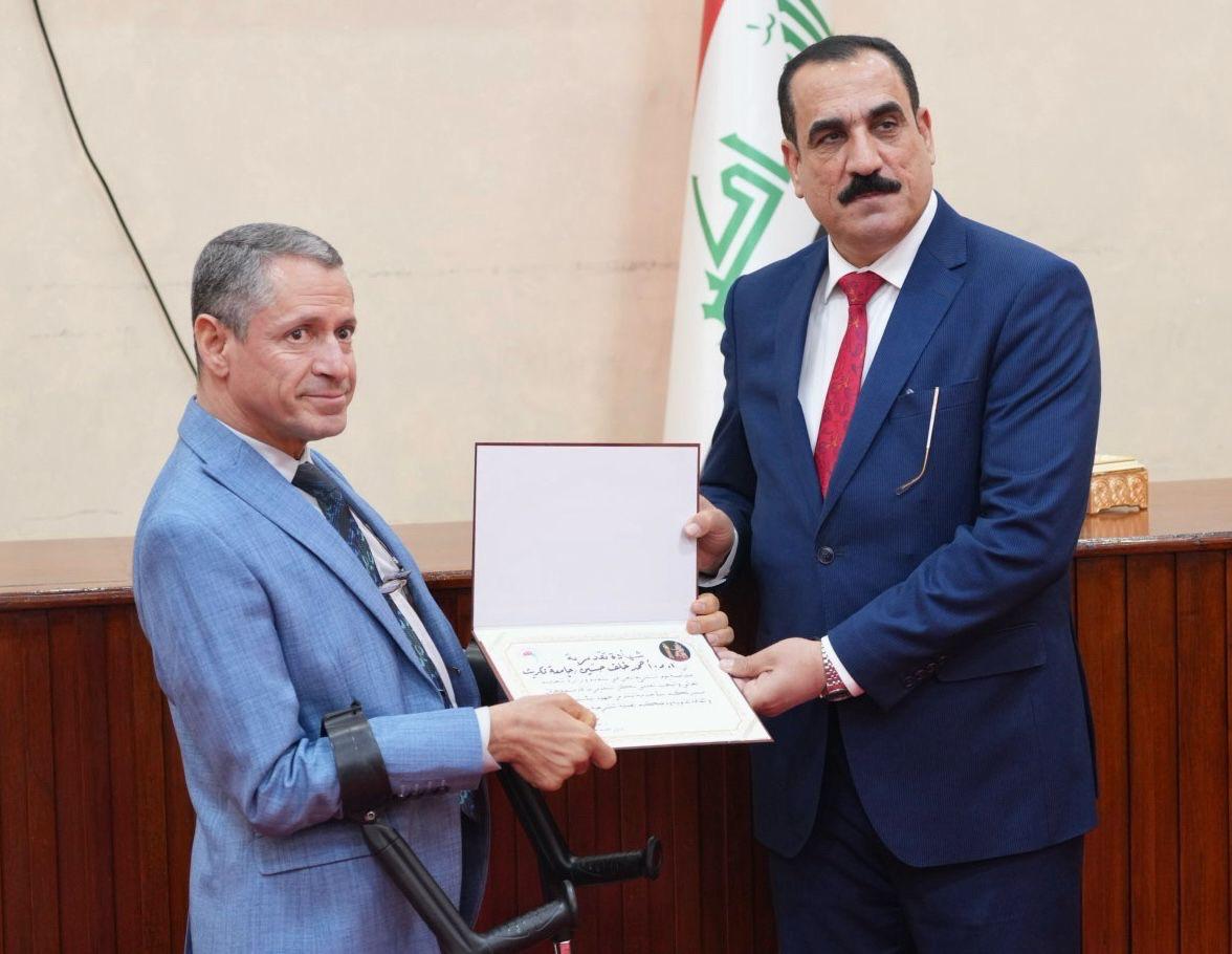 بمناسبة يوم التشريع العراقي الذي يصادف اليوم الاربعاء 15 كانون الثاني، كرمت وزارة التعليم العالي والبحث العلمي مجموعة من الاساتذة الرواد والاساتذة المتميزين في اختصاص القانون من الجامعات العراقية المختلفة ممن كان لهم الدور البارز في رفد المسيرة التعليمية القانونية بخبراتهم وابحاثهم ومؤلفاتهم القيمة، وقد كان من بين هذه الثلة الخيرة من الاساتذة المتميزين الأستاذ الدكتور احمد الدخيل استاذ المالية العامة والقانون المالي في كلية القانون جامعة تكريت حيث سلمه الشهادة التقديرية السيد الوكيل الاداري لوزارة التعليم العالي والبحث العلمي الأستاذ الدكتور عدنان الجميلي المحترم، ليعد هذا التكريم تكريما لكلية القانون ولجامعة تكريت بصورة عامة.