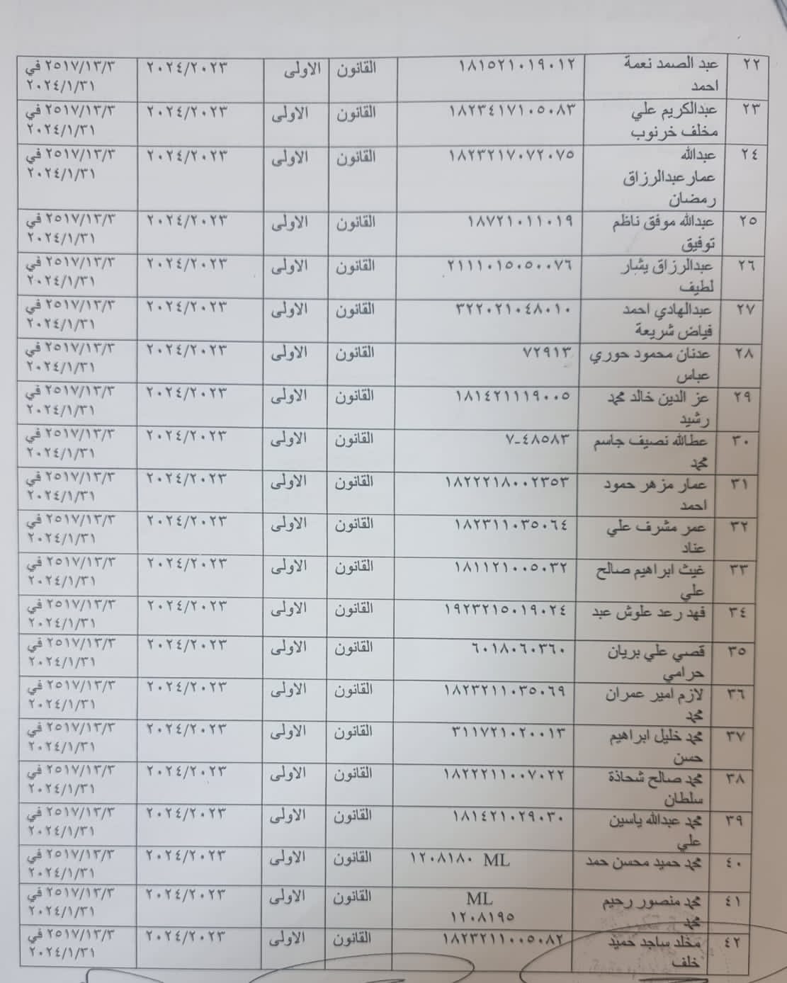 على الطلبة الواردة أسماؤهم في الجداول المرفقة جلب نسخة من الوثيقة الاصلية ومراجعة كلية القانون شعبة التسجيل لغرض تقديم طلب برفع الاسم من الأمر الجامعي الخاص بالغاء القبول وخلال مدة يومين من تاريخ نشر الإعلان