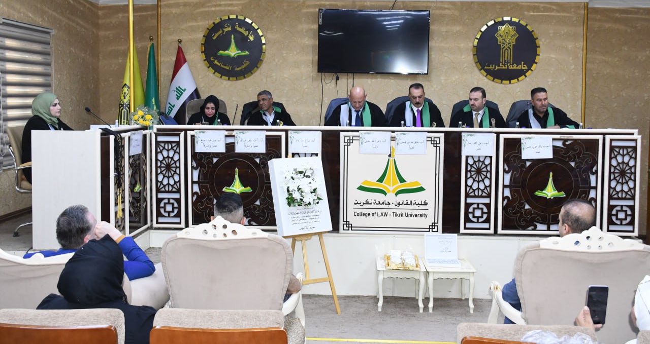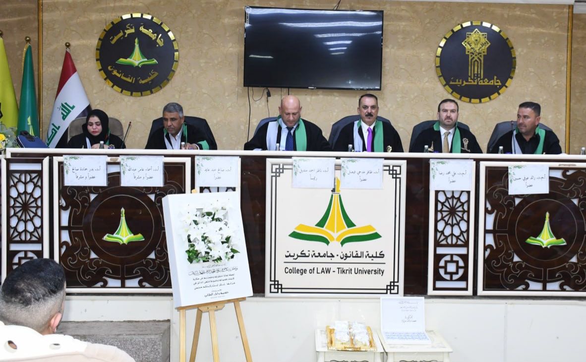 نوقشت في كلية القانون - جامعة تكريت اطروحة دكتوراه في القانون العام للطالبة (حفصه وائل مولود) والموسومة ب (القرارات الادارية بين السحب والالغاء دراسة تطبيقية في مديرية تربية صلاح الدين) على قاعة الشهيد الدكتور ضامن العبيدي في مبنى الكلية صباح يوم الاربعاء الموافق 15-10-2024.