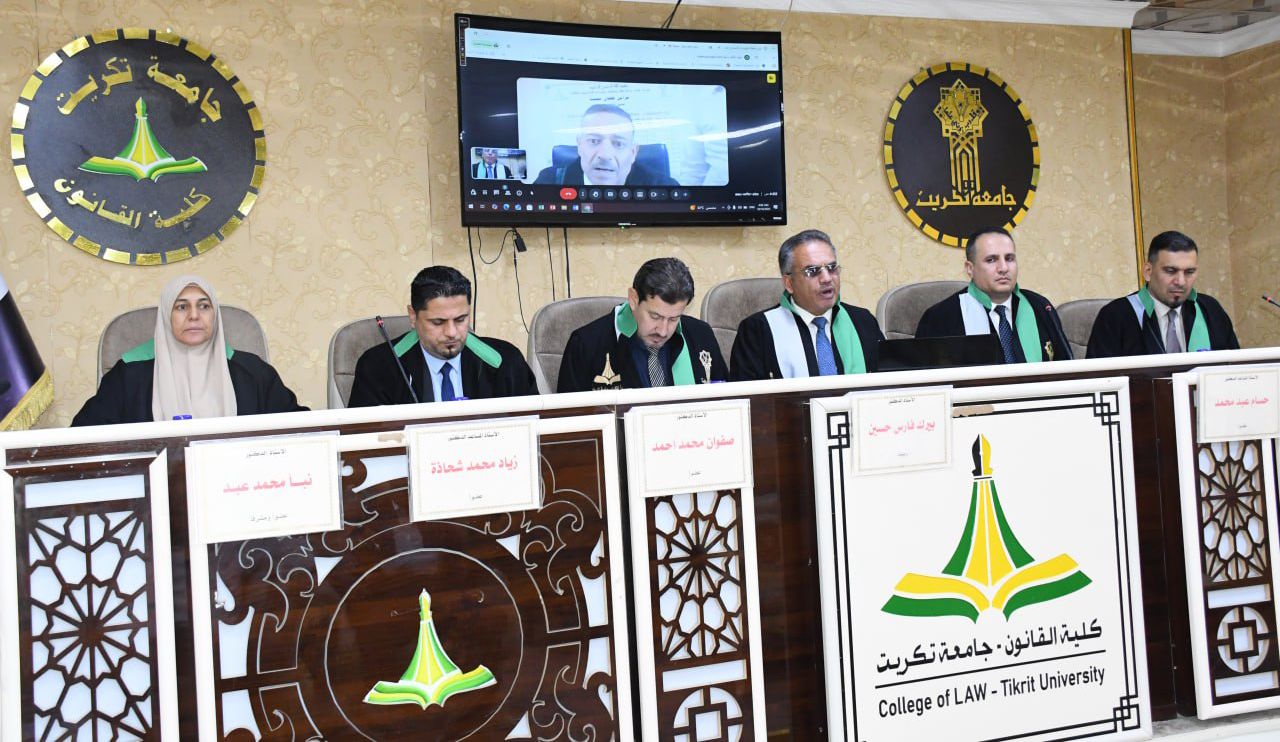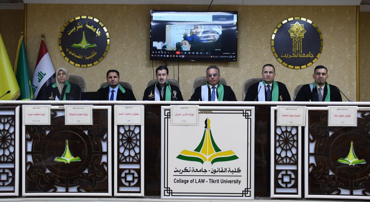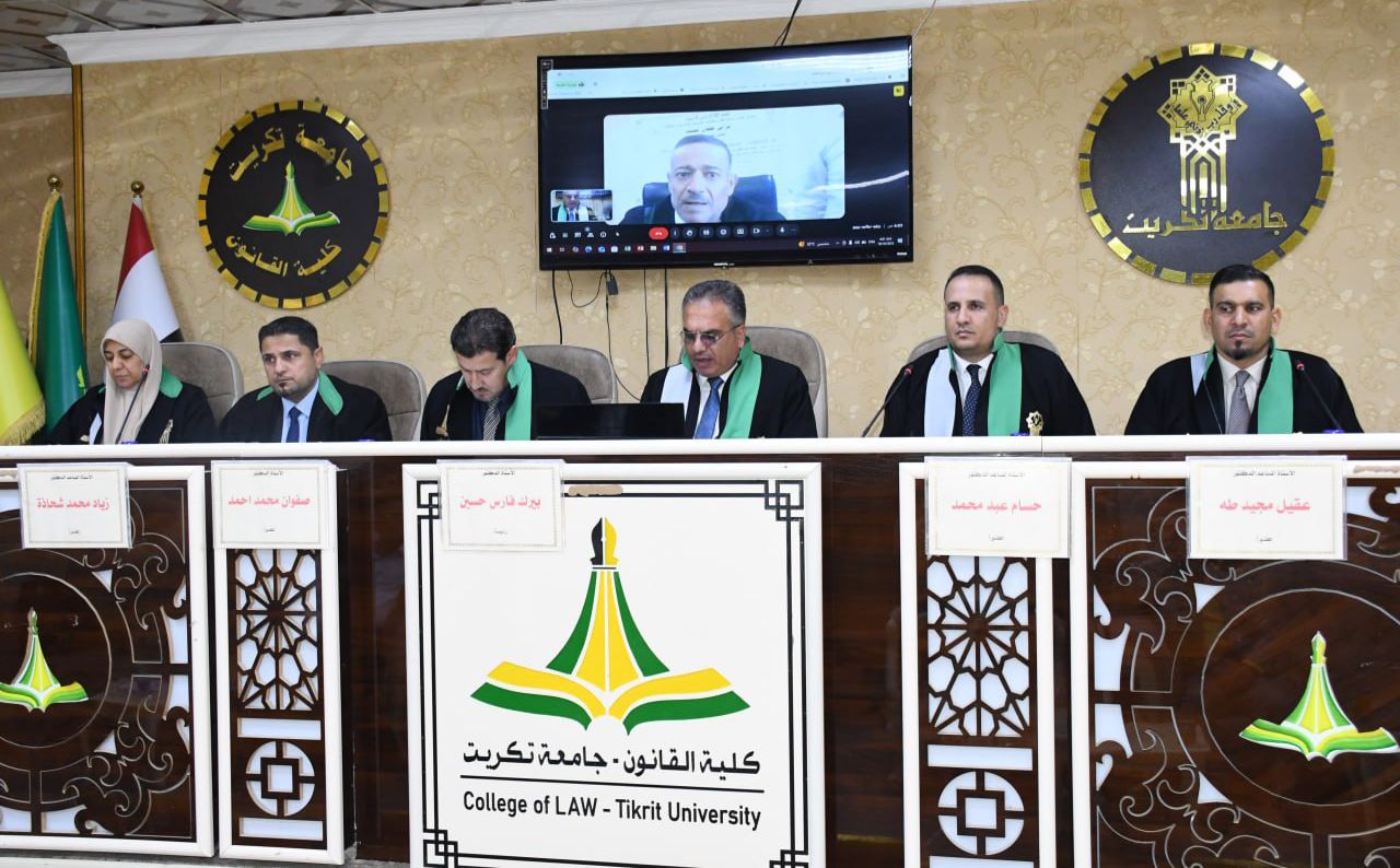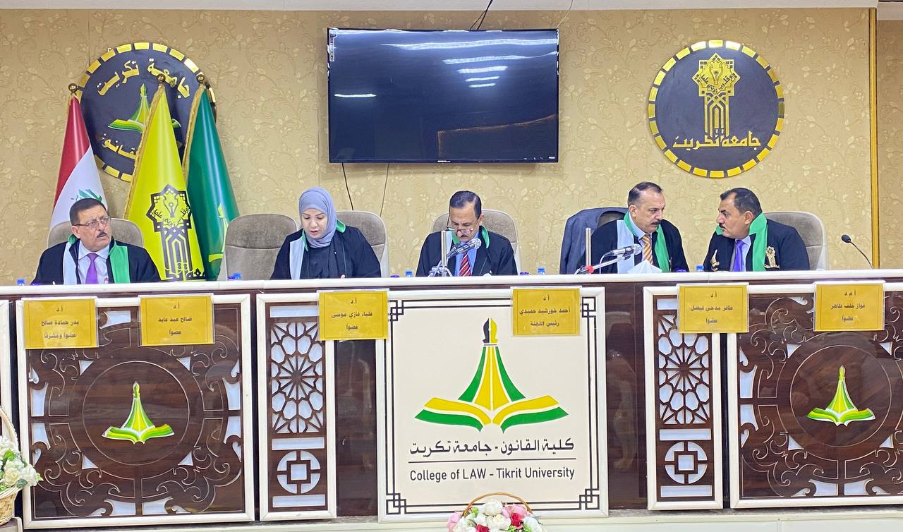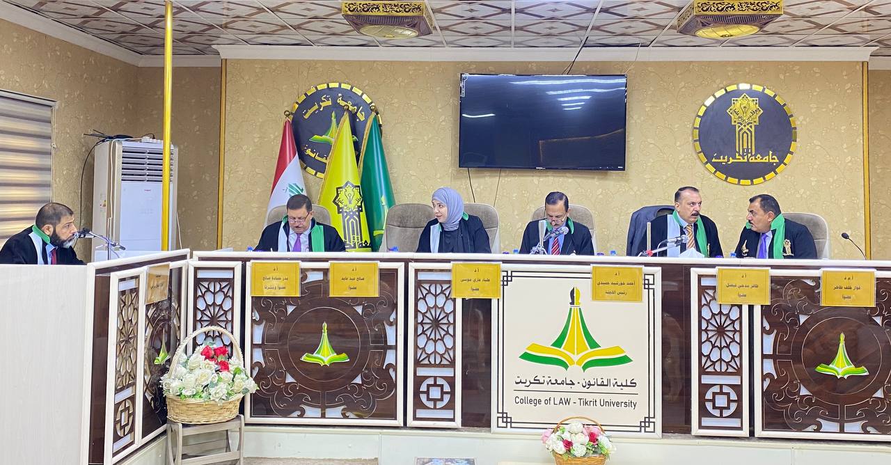 نوقشت في كلية القانون - جامعة تكريت اطروحة دكتوراه في القانون العام للطالبة (فراس طعان محمد) والموسومة ب (عدول القاضي عن نظر الدعوى لصالح القضاء الأجنبي - دراسة مقارنة) على قاعة الشهيد الدكتور ضامن العبيدي في مبنى الكلية صباح يوم الخميس الموافق 16-10-2024.