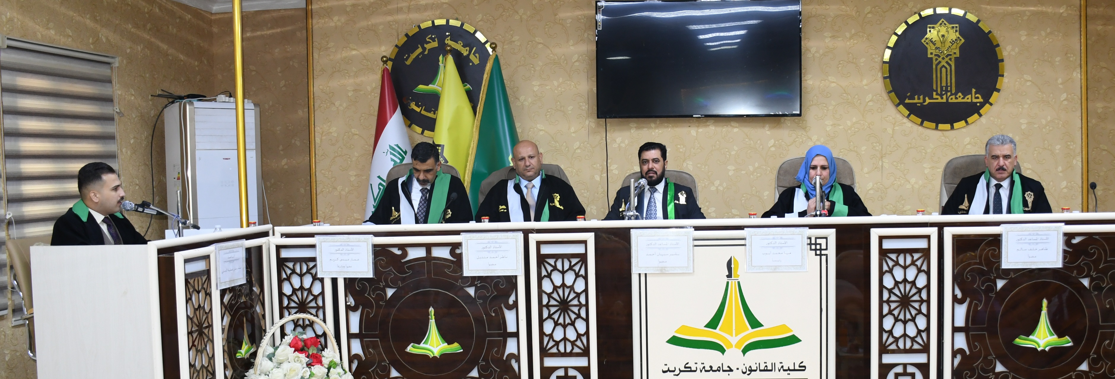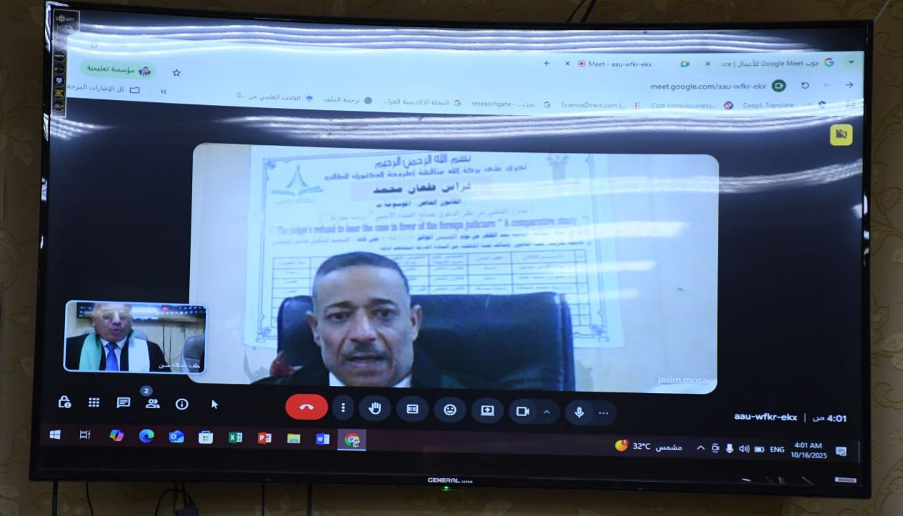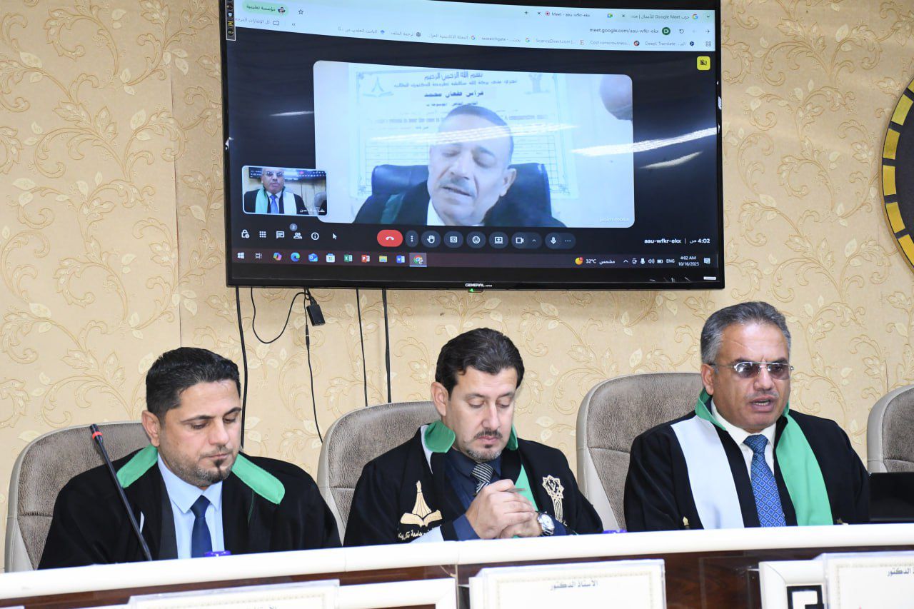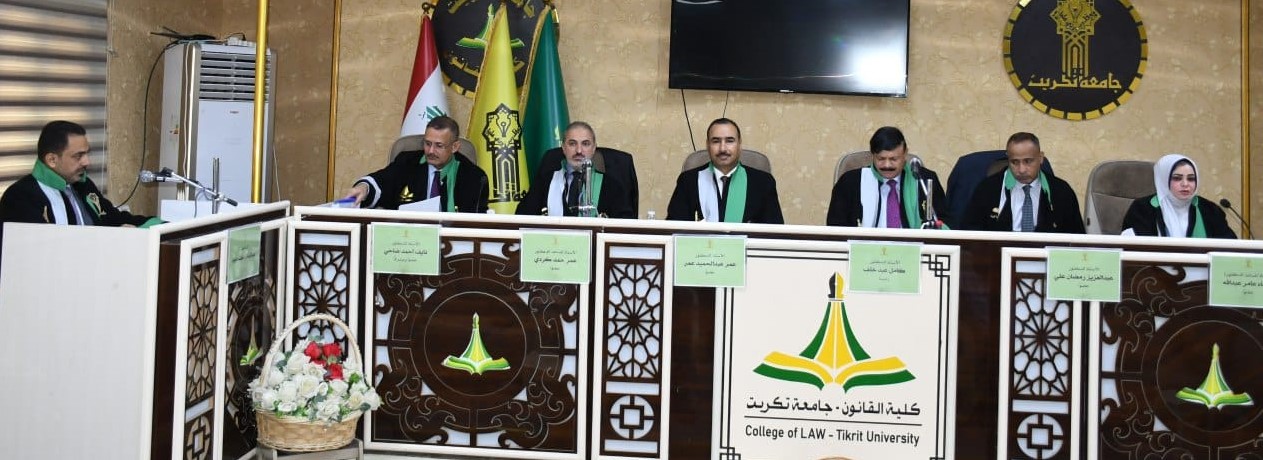 نوقشت في كلية القانون - جامعة تكريت اطروحة دكتوراه في القانون العام للطالبة (فراس طعان محمد) والموسومة ب (عدول القاضي عن نظر الدعوى لصالح القضاء الأجنبي - دراسة مقارنة) على قاعة الشهيد الدكتور ضامن العبيدي في مبنى الكلية صباح يوم الخميس الموافق 16-10-2024.
