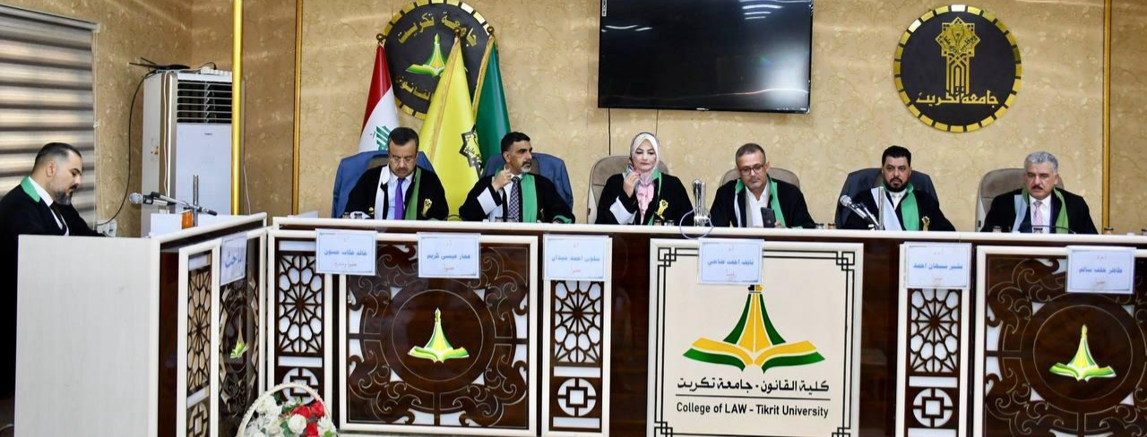 نوقشت في كلية القانون - جامعة تكريت أطروحة دكتوراه في القانون الدولي العام للطالب ( احمد خضير صالح ) والموسومة ب (التفاوت في الالتزام بقواعد القانون الدولي العام) على قاعة الشهيد الدكتور ضامن العبيدي في مبنى الكلية صباح يوم الخميس الموافق 1-8-2024.
