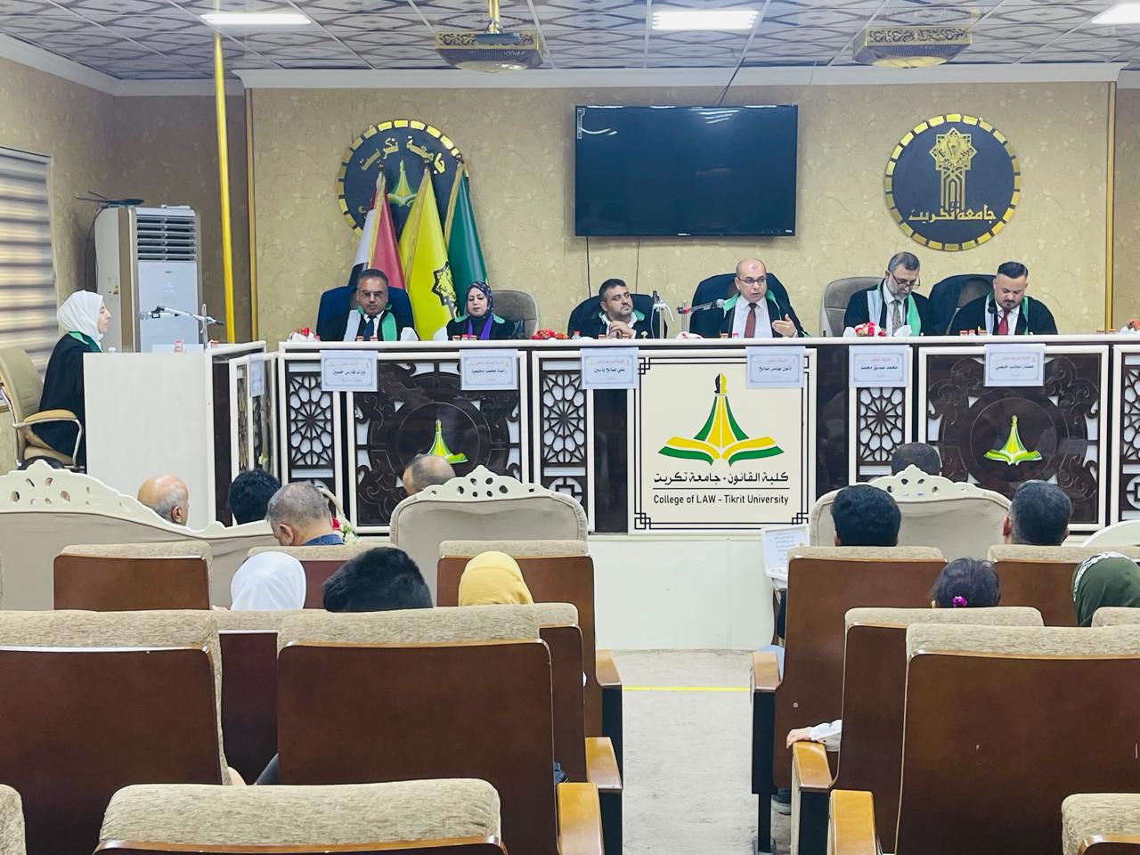 نوقشت في كلية القانون - جامعة تكريت أطروحة دكتوراه في القانون العام للطالبة (ندى ساجر ناصر) والموسومة ب(تعليق نقل ملكية العقار على تسديد الثمن في المجمعات السكنية الاستثمارية - دراسة مقارنة) على قاعة الشهيد الدكتور ضامن العبيدي في مبنى الكلية صباح يوم الخميس الموافق 3-10-2024.
