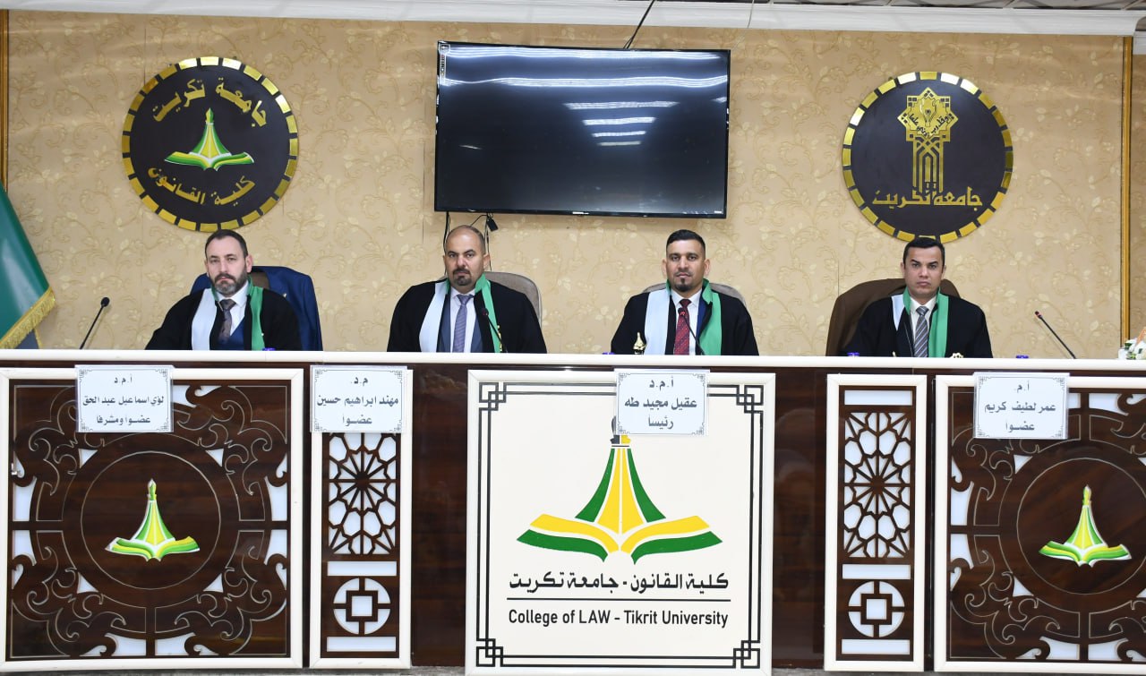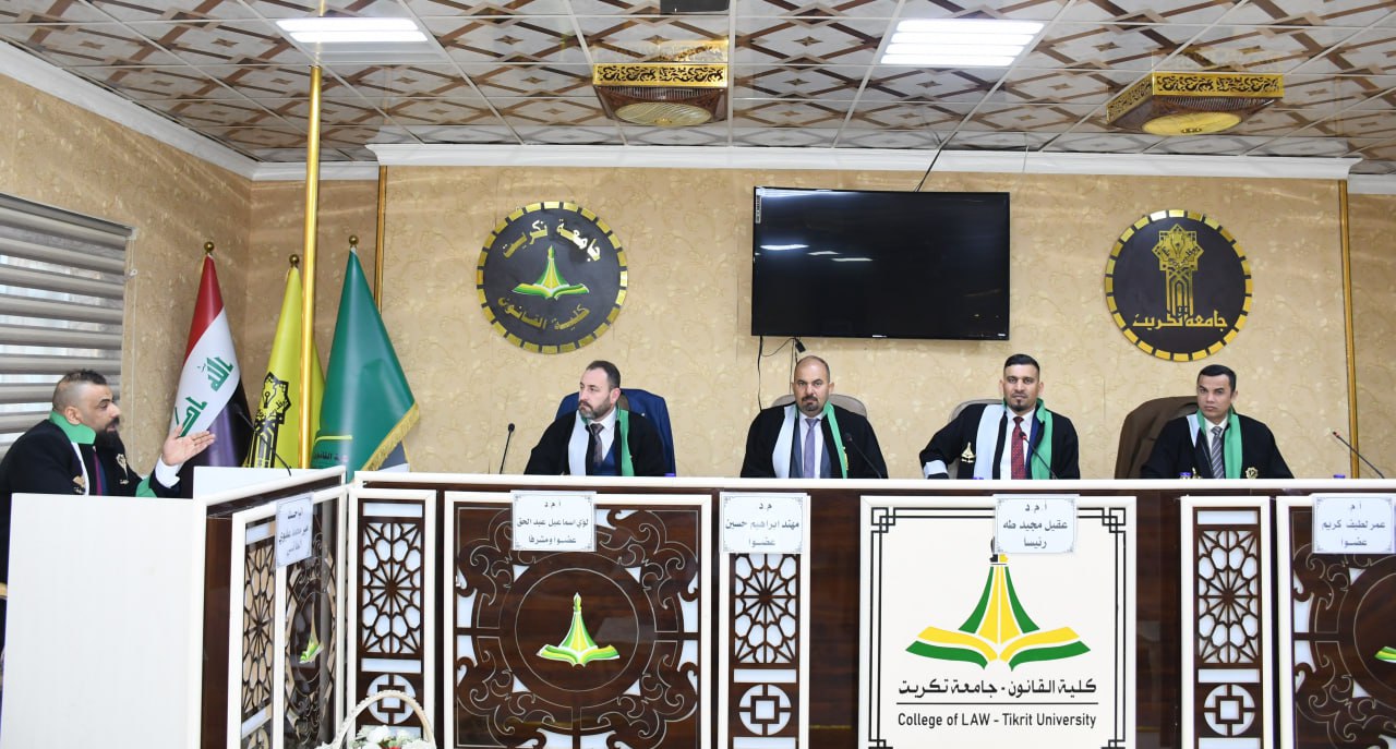 نوقشت في كلية القانون - جامعة تكريت بحث دبلوم عالي في القانون العام للطالب (أمير محمد عليوي) والموسومة ب (خصوصية التحكيم امام مركز التسوية والتحكيم الرياضي العراقي - دراسة مقارنة) وعلى قاعة الشهيد الدكتور ضامن العبيدي صباح يوم الاثنين الموافق 27-1-2025.
