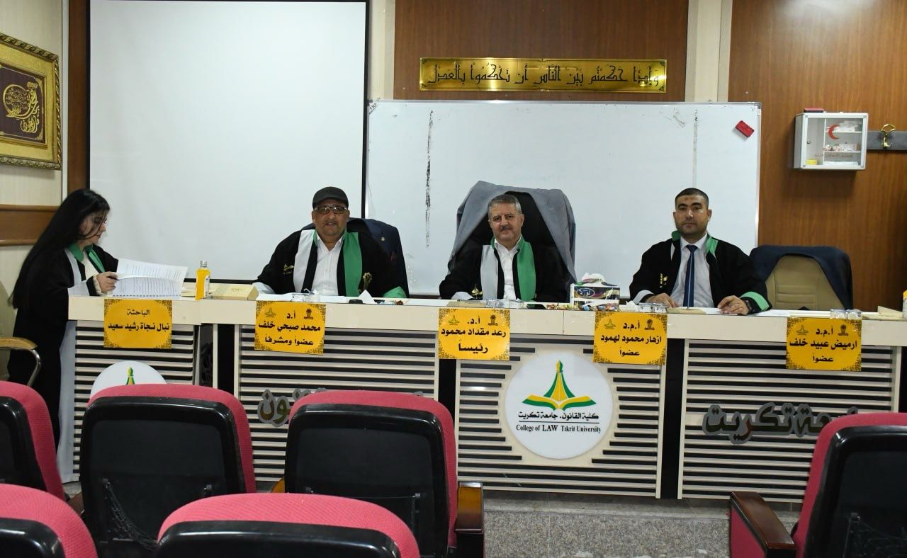 نوقشت في كلية القانون - جامعة تكريت رسالة ماجستير في قانون الخاص للطالبة (نبال نجاة رشيد) والموسومة ب (احكام الجنسية من المنحدرة من الاب - دراسة مقارنة) وذلك على قاعة الشهيد الدكتور ضامن العبيدي في مبنى الكلية صباح يوم الاحد الموافق 20-7-2025.