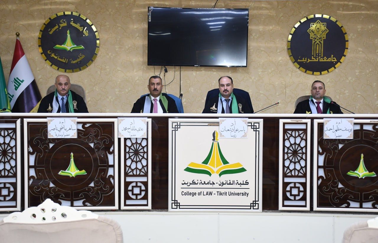 نوقشت في كلية القانون - جامعة تكريت رسالة ماجستير في القانون الجنائي للطالبة (آيات جبار عبد عون) والموسومة ب (الحماية الجنائية للأصول - دراسة مقارنة.) وذلك على قاعة الشهيد الدكتور ضامن العبيدي صباح يوم الاحد الموافق 19-10-2025.