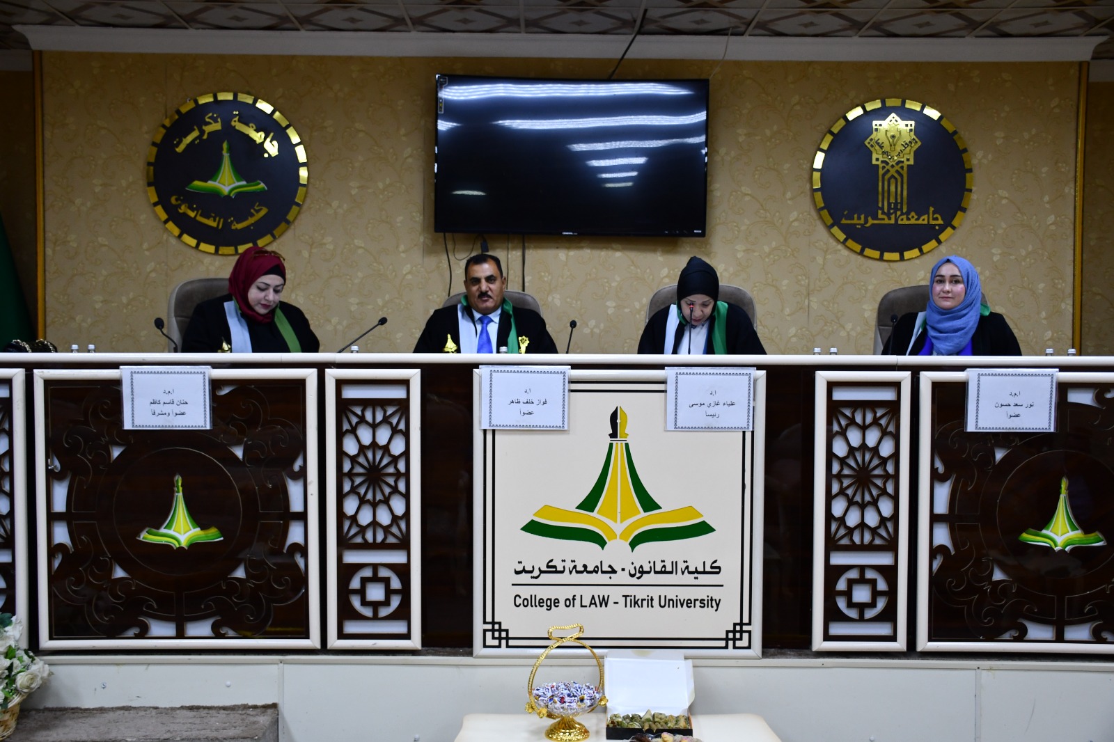 نوقشت في كلية القانون - جامعة تكريت رسالة ماجستير في قانون العمل للطالبة (ايمان هادي دوس) والموسومة ب (الحماية القانونية للحق في الخصوصية للعامل في عقد العمل عن بعد) وذلك على قاعة الشهيد الدكتور ضامن العبيدي في مبنى الكلية صباح يوم الخميس الموافق 23-7-2025.