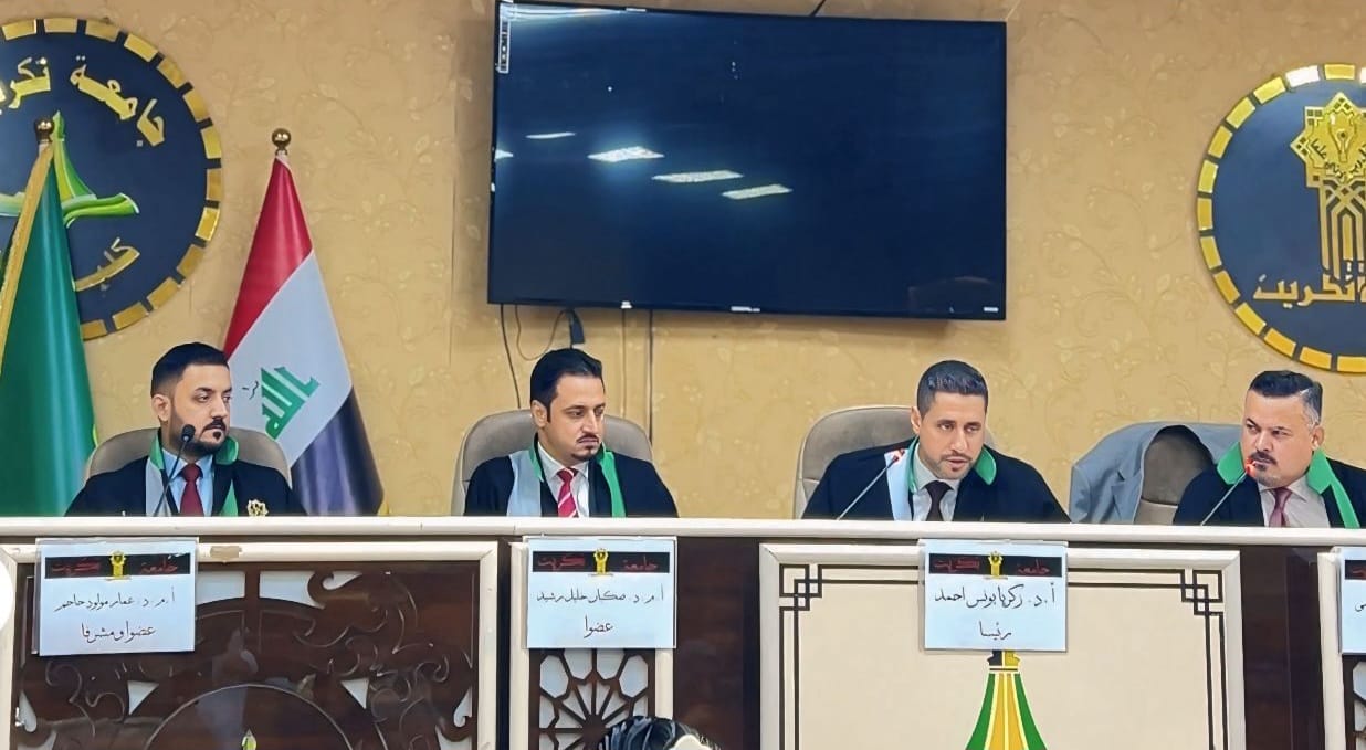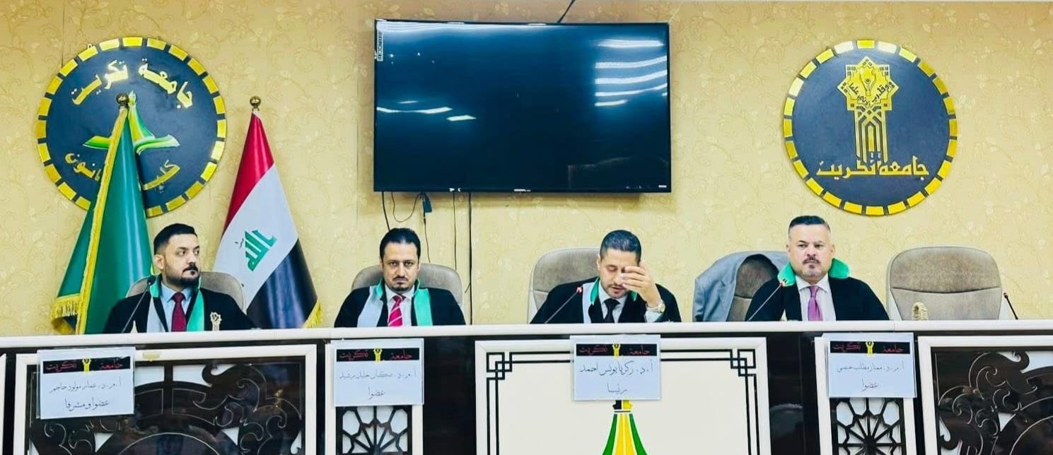 نوقشت في كلية القانون - جامعة تكريت رسالة ماجستير في القانون الخاص للطالب (محمد ستار عليوي حسين) والموسومة ب (حماية الغير حسن النية عند تعامله مع الشركات التجارية في مرحلة نشاطها - دراسة مقارنة) وذلك على قاعة الشهيد الدكتور ضامن العبيدي في مبنى الكلية صباح يوم السبت الموافق 6-9-2025.